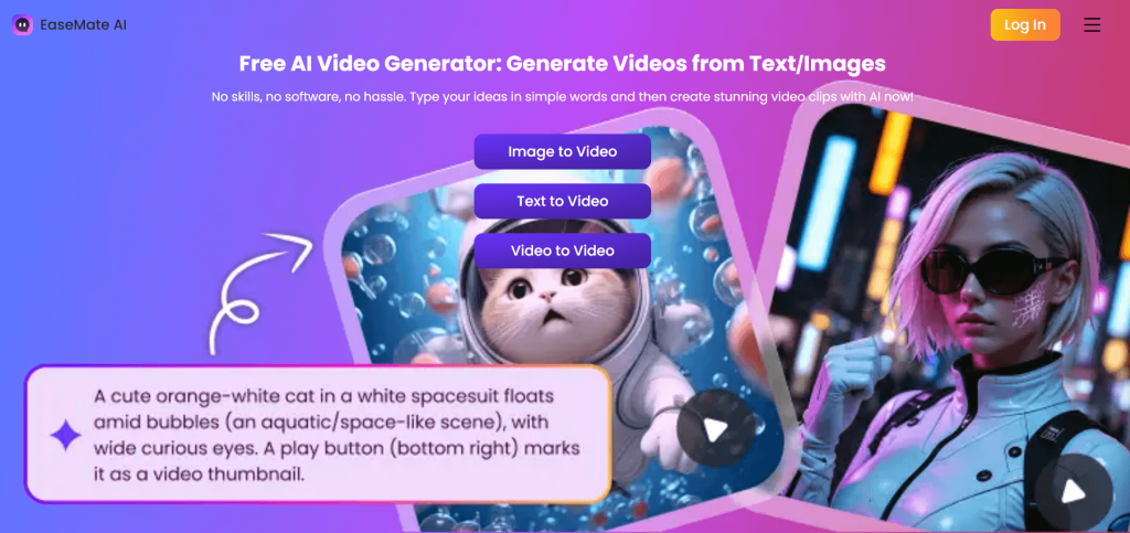 At a functional level, EaseMate AI can handle two of the most common forms of AI video generation: turning text into video and turning images into animated clips. But it does it differently by providing multiple ways to achieve those results.
