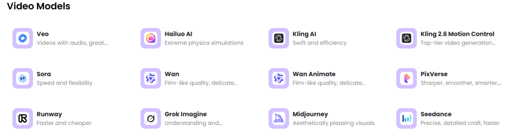 Its all-in-one AI video generation feature makes it a practical choice for experimentation. Thanks to that, enthusiasts who have always been curious about the individual models, how they perform, the themes or styles they excel in, as well as their technical boundaries, can experiment all they want. They can also use it to explore diverse creative directions, refine ideas, or compare how differently the models handle similar prompts —something you simply can’t do on single-model platforms.